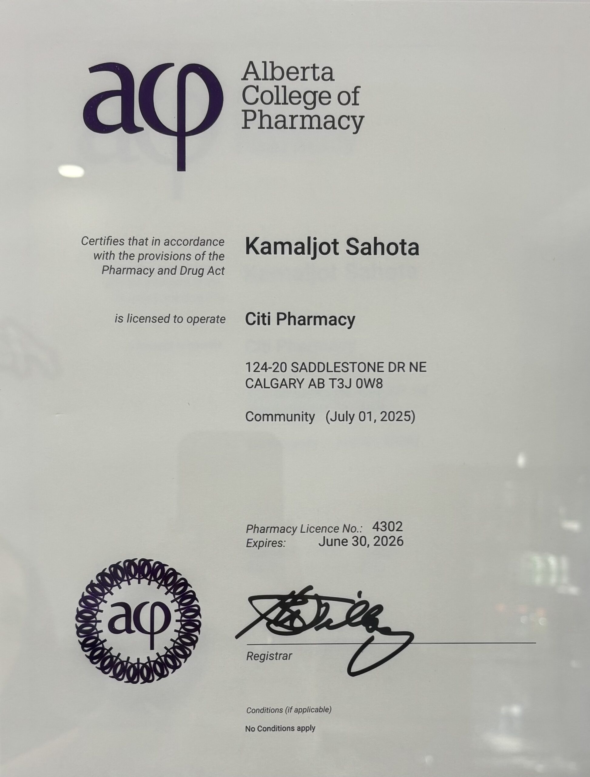 Citi Pharmacy, License No. #4302; #124-20 Saddlestone Dr. NE, Calgary, Alberta T3J 0W8: Phone: (403) 930-2461; Fax: (403) 930-2462; Proprietor: Kamaljot Sahota; Proprietor’s Representatives: Harsh Patel, Kunjal Patel; Pharmacy Licensee: Kamaljot Sahota, #13794; Pharmacy Licensee Email: citipharmacy@pharmachoice.ca