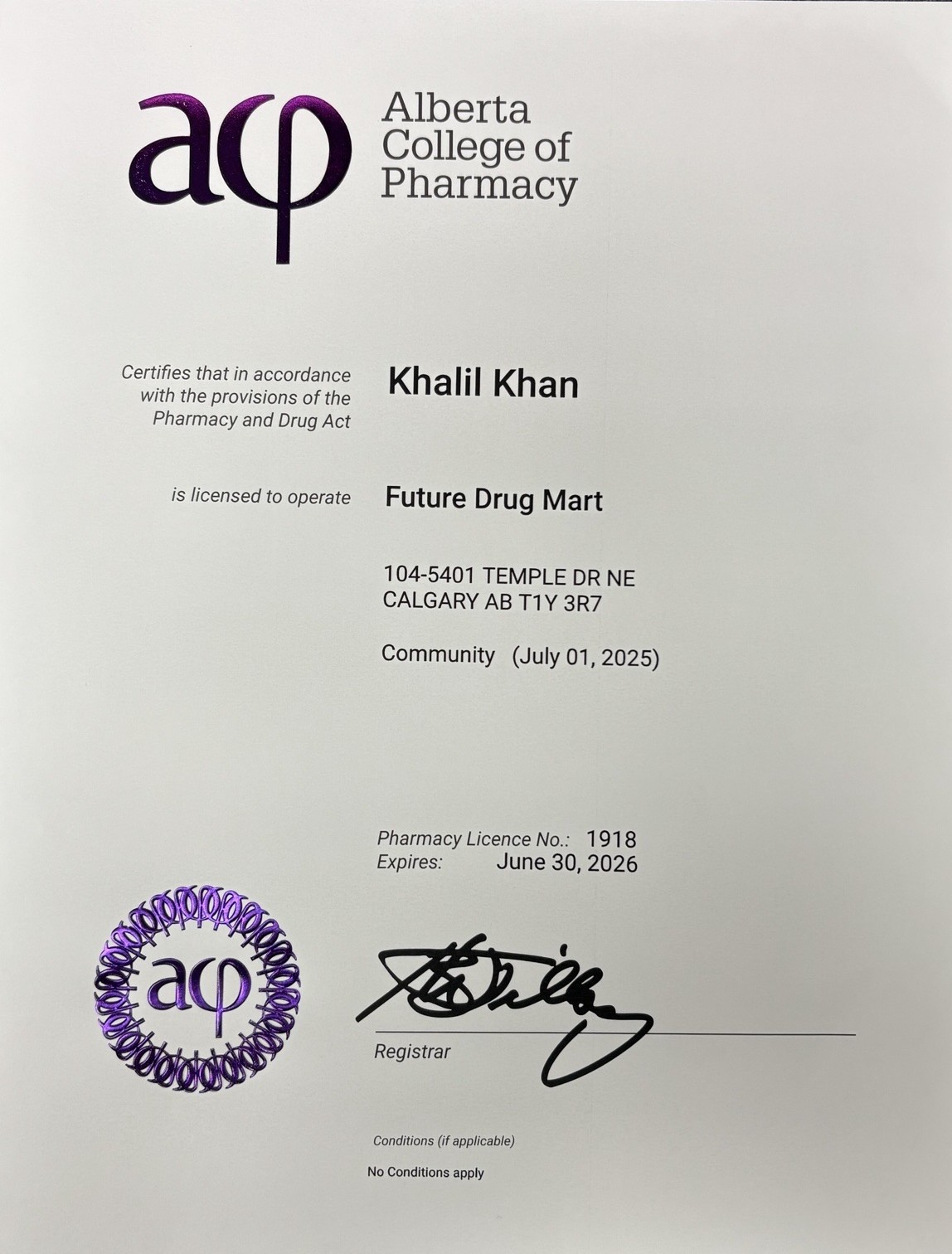 Future Drug Mart, License No. 1918; #104-5401 Temple Drive NE, Calgary, Alberta T1Y 3R7; Phone: 403-293-6200; Fax: 403-293-6205; Pharmacy Licensee: Khalil Khan, #6248; Pharmacy Licensee Email: futuredrugmart@pharmachoice.ca