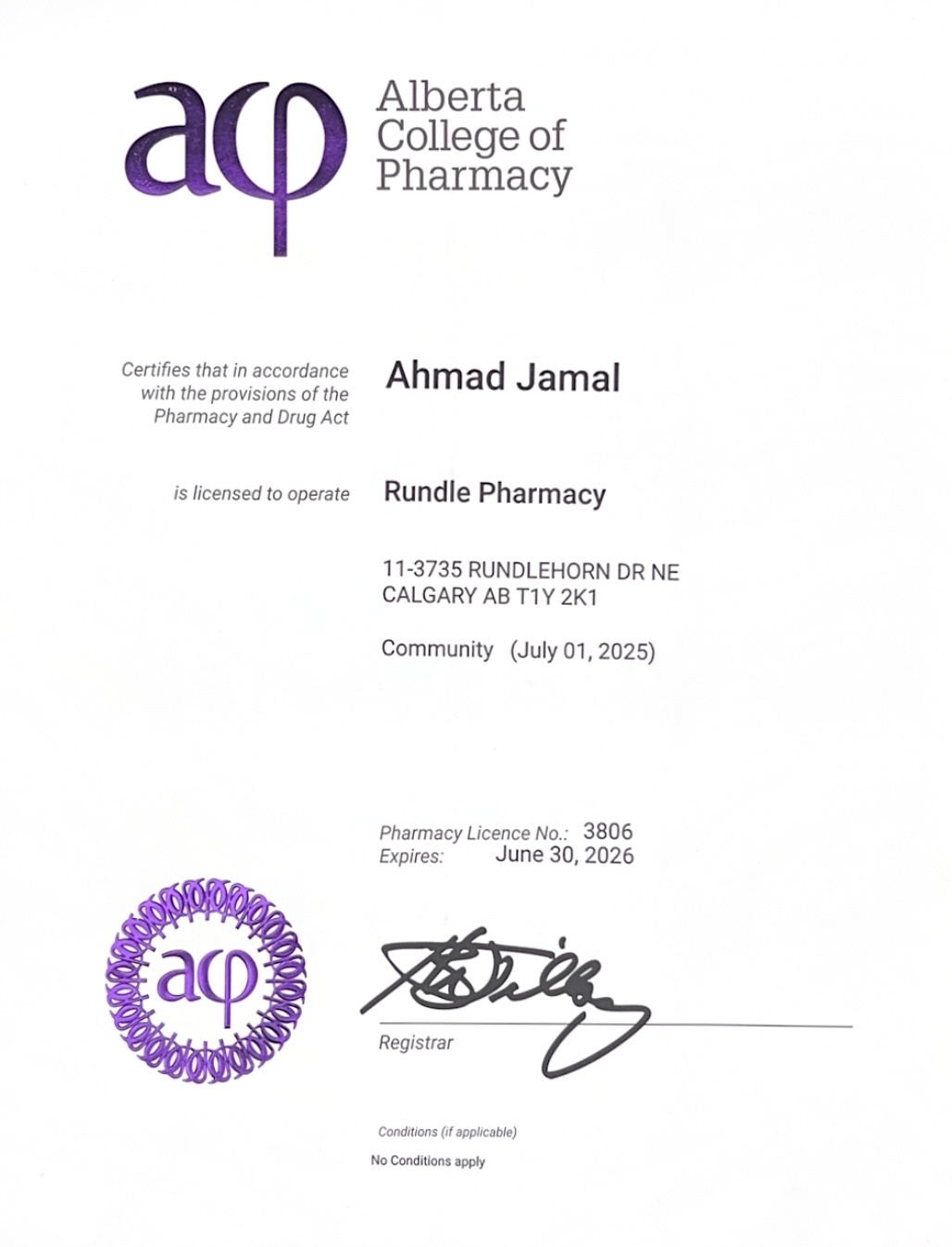 Rundle Pharmacy, License No: 3806; 11-3735 Rundlehorn Dr NE Calgary, Alberta T1Y 2K1; Phone: (403) 798-9280; Fax: (587) 538-4200; Proprietor/Pharmacy Licensee: Ahmad Jamal, #7490; Pharmacy Licensee Email: rundlepharmacy@hotmail.com