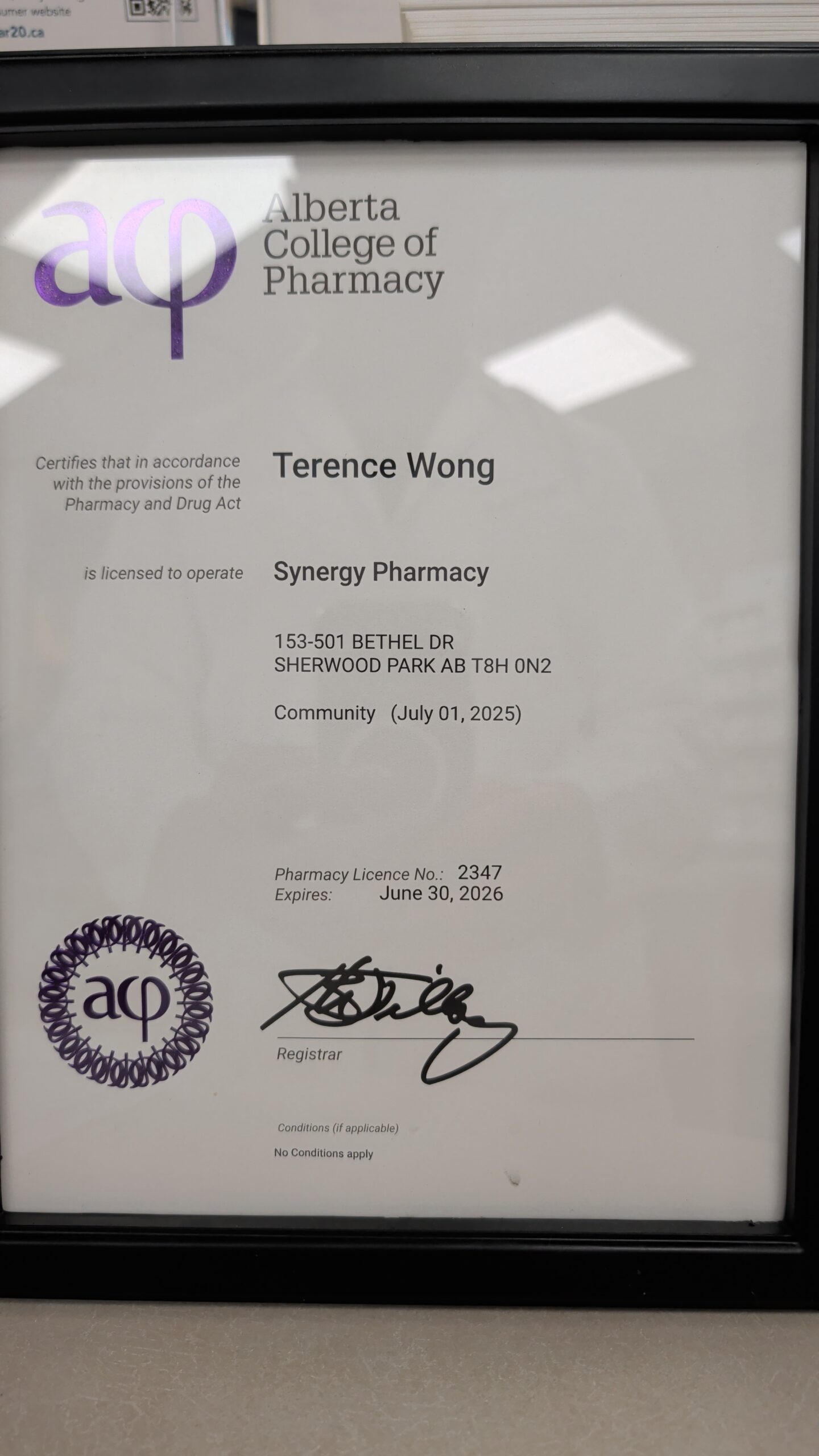 Synergy Pharmacy, License No. 2347; 153-501 Bethel Drive, Sherwood Park, Alberta T8H 0N2; Phone: (780) 449-2017; Fax: (780) 449-6025; Pharmacy Licensee Manager: Terence Wong, #12448 Email: synergypharmacy@pharmachoice.ca Proprietor Representative: Huy Luong, 153-501 Bethel Drive, License No. 2347, (780) 449-2017