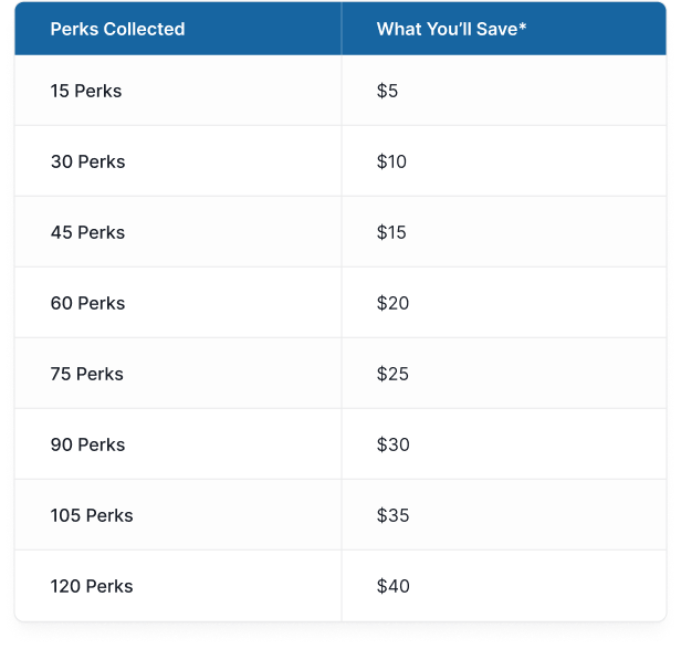Once you have collected 15 Perks, you can redeem them for $5 off your next purchase*. You can also let your Perks add up for even bigger savings!